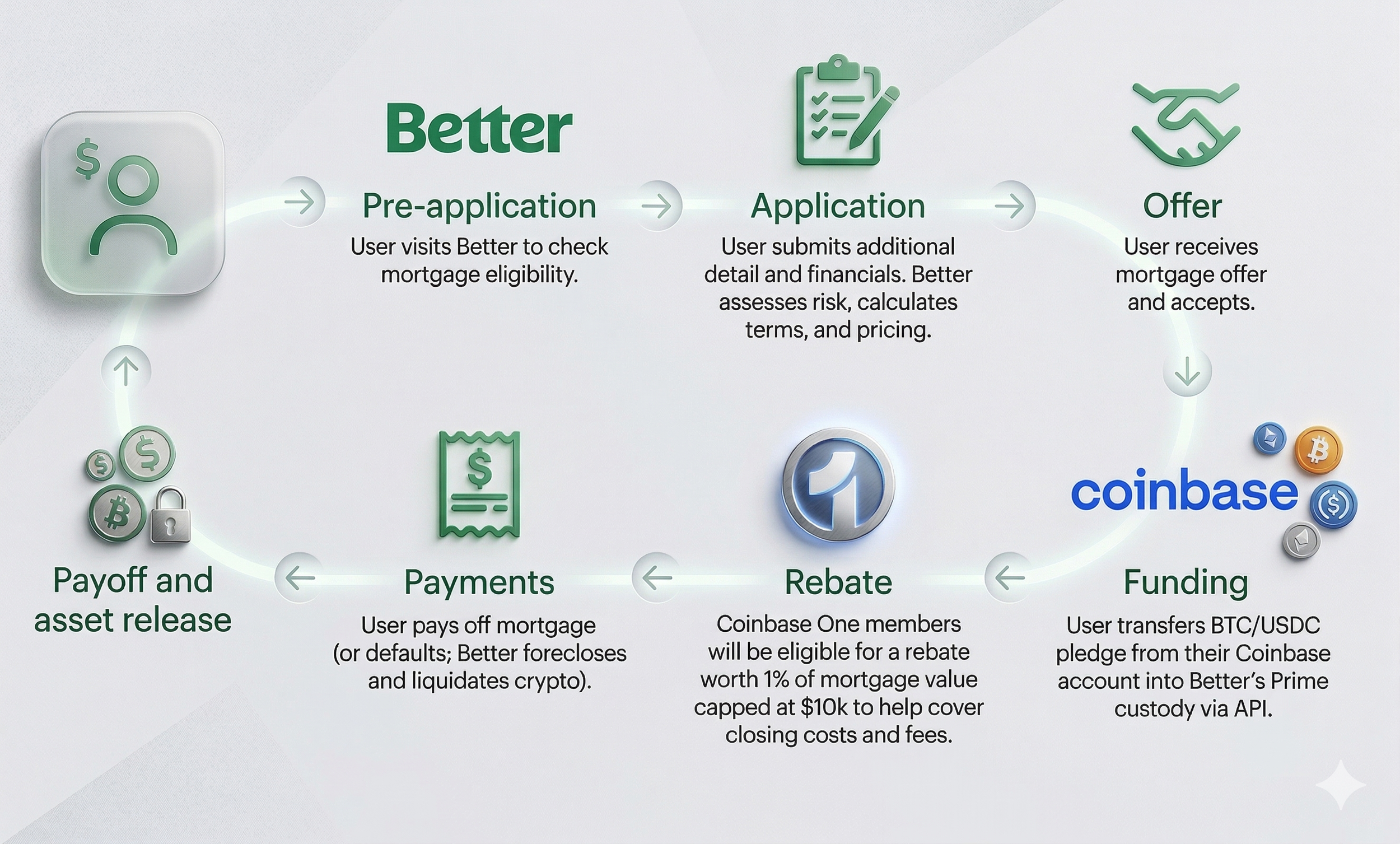 On a $500k home, you could pledge $250k in Bitcoin to secure a $100k down payment loan. Your crypto stays in custody and comes back to you when the loan is repaid. Coinbase One members also get a 1% rebate on the mortgage, capped at $10k.